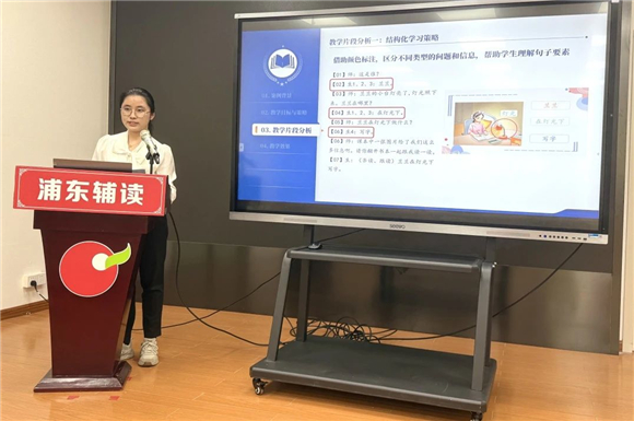 奚陈妍老师以三年级上册《小台灯》一课为例,展示了“四维协同”策略在课堂中的实际应用。通过结构化学习策略和交互式表达策略,学生逐步拆解并整合句子要素,提高理解能力。同时,借助生活情境下的分层任务单设计,学生将课堂所学迁移至生活场景,实现了知识的内化与应用。