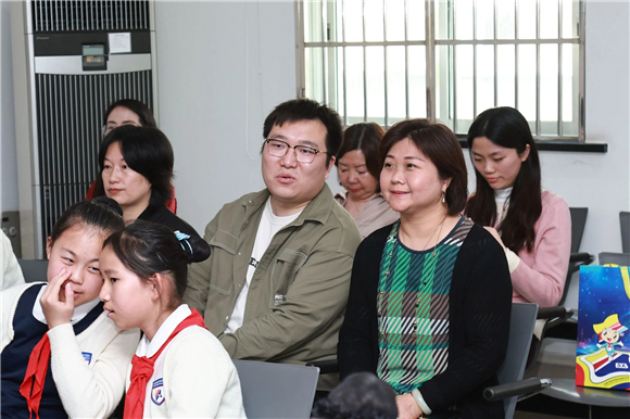 家庭是孩子成长的第一课堂,家长的言传身教对孩子影响深远。四2中队郭隽禾同学的妈妈也是一位严谨细致的法官,对待法庭工作,她冷静理智,富有经验,听闻学校将与六里法庭共建,郭妈妈和孩子一同上台,共读法治教育倡议书。