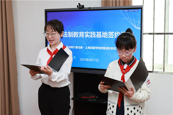 为进一步加强新时代未成年人权益保护和法治教育工作,大力弘扬社会主义法治精神,提升学生的法治意识和法律素养,2025年4月11日,上海戏剧学院附属浦东新世界实验小学与浦东新区人民法院六里人民法庭举行校外法治教育实践基地签约仪式。