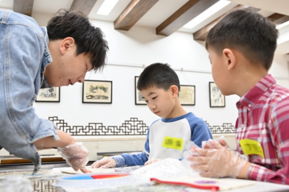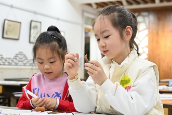 美工坊内,孩子们展开想象的翅膀,创作出了一幅幅童趣盎然的作品。在老师的悉心指导下,孩子们有的玩起了有趣的拓印游戏,仿佛把整个春天都悄悄装进了作品中;有的拿起五彩画笔,专注地给小葫芦勾勒出漂亮的花纹。