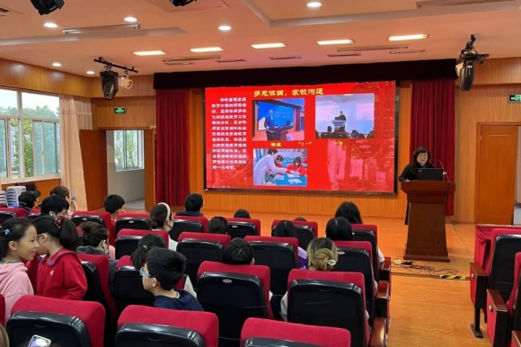 实地参观结束后,家长们前往四楼多功能厅参加会议。本次活动,金川校区分会场连线枣庄校区主会场,现场直播。主会场由孙伟菁副校长主持,分会场由金海虹副校长主持。上海市建平实验中学校长、上海市特级校长、正高级教师魏澜校长为两个校区的家长和孩子们作了一场《智变时代,心守本源——教育的突围与回归》专题讲座。