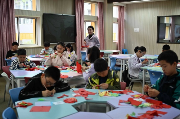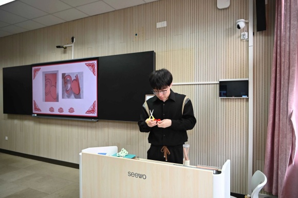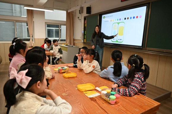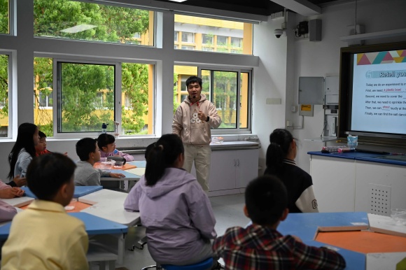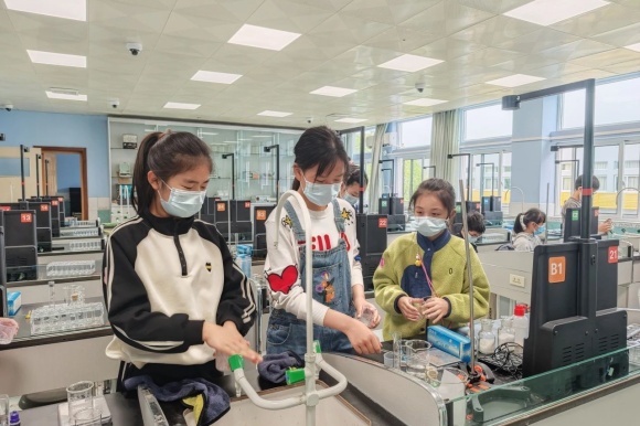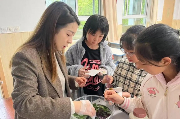 09:10,近200名学生步入不同的专用教室,尝试植物拓染、绘写春日来信、体验“绳”系建实、制作文化徽章、感受有趣物理、挑战校园寻宝、学习合作成塔、走进剪纸文化、自制魔术天气瓶,奏响会跳舞的盐交响曲,跨学科课程设计打破了知识的壁垒,让学生在真实情境和具身实践中体验学习的乐趣。