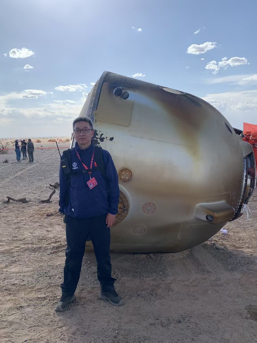 王志江在完成神舟十二号载人飞船返回舱着陆任务后与返回舱合影