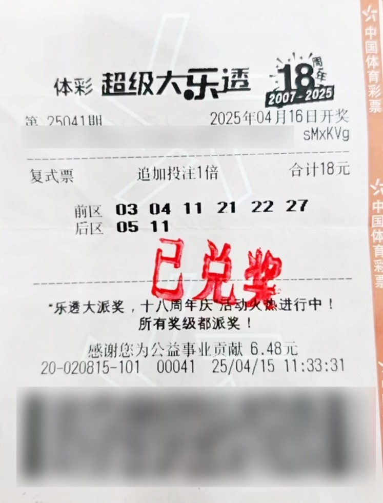 2025年4月16日晚,体彩大乐透25041期开奖,当期开奖结果为:前区开出号码03、04、21、22、27;后区开出号码05、11,为国家筹集公益金1.33亿。