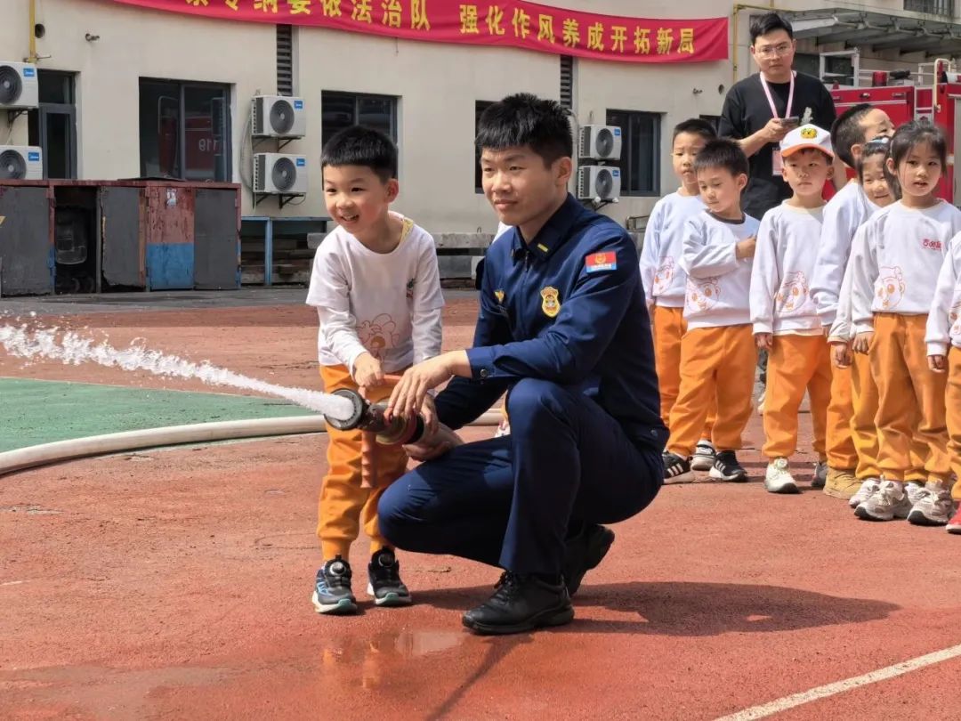 “消防员叔叔们日常是怎么生活训练的呢?”干净整洁的盥洗室、摆放整齐的洗漱用品、形似豆腐块的被褥一一展示在孩子们眼前。在户外训练场上,消防员现场为大家展示了挂钩梯操、绳索攀爬等训练动作。孩子们在消防员的指导下,体验了消防水枪的使用方法。