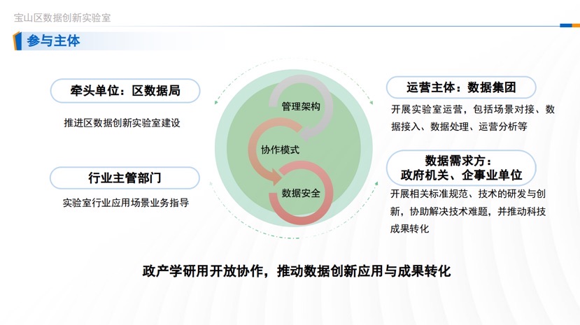 宝山区数据创新实验室依托南大智慧城九章智算港,线下800平方米的场地配置满足开发、运营、成果展示等需求,线上数据空间拥有丰富的公共数据资源,提供了融合区块链、隐私计算、安全沙箱等技术的数字底座,支撑实验室数据归集、治理、开发和流通等全流程管理。实验室作为公共数据与社会数据融合应用的试验田、培育数字创新应用的孵化器,以政产学研用开放协作模式开展,形成“优选场景-安全开发-成果转化”全流程运作模式,推动数据创新应用与成果转化。目前,已优先在商贸物流、金融服务、人力资源三个重点领域开展场景试点,并与多家单位和企业建立了合作关系,不断探索数据要素与实体经济深度融合的创新实践,为构建数字经济新质生产力提供实践样板。
