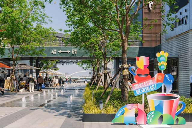 作为本届西岸国际咖啡生活节的重要视觉焦点,西岸梦中心剧院广场的5米巨型咖啡杯装置,整体设计取材于本届主视觉,以缤纷色彩呼应“咖啡+生活”的轻快主题。拟人化的咖啡杯造型诙谐可爱,是来访者们不可错过的打卡之选,其顶部的红心象征热爱与分享,胸前的爱心则融合了音乐与艺术元素。此外,水岸沿线空间的多件打卡拍照装置融合多元场域的文化基因、风格各异,更有玩味十足的宠物标语,让家中爱宠也拥有社交平台封面照。
