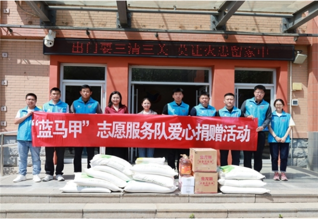 “蓝马甲”志愿服务队为学校捐赠了米、面、油、绘画器材等教学用材。