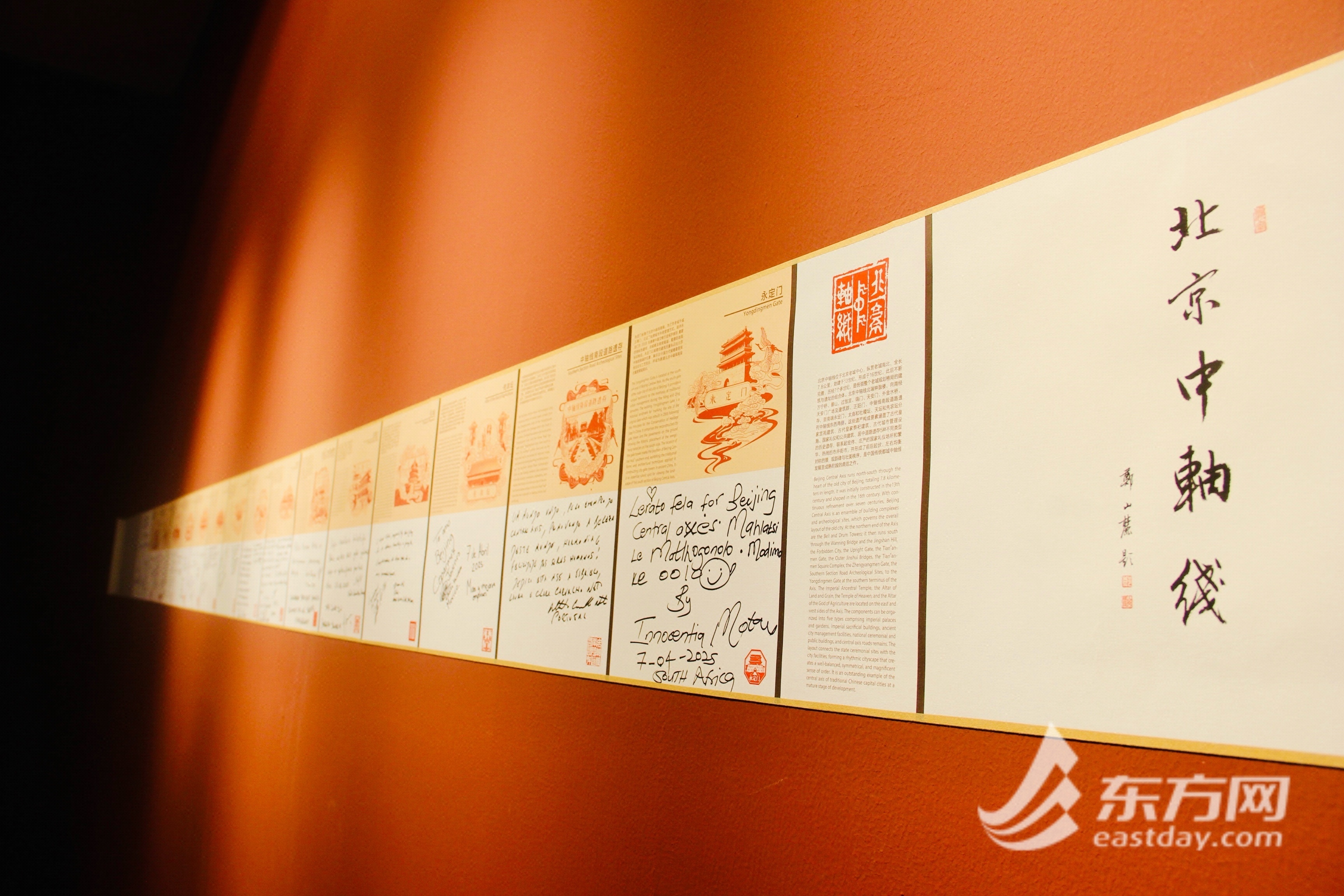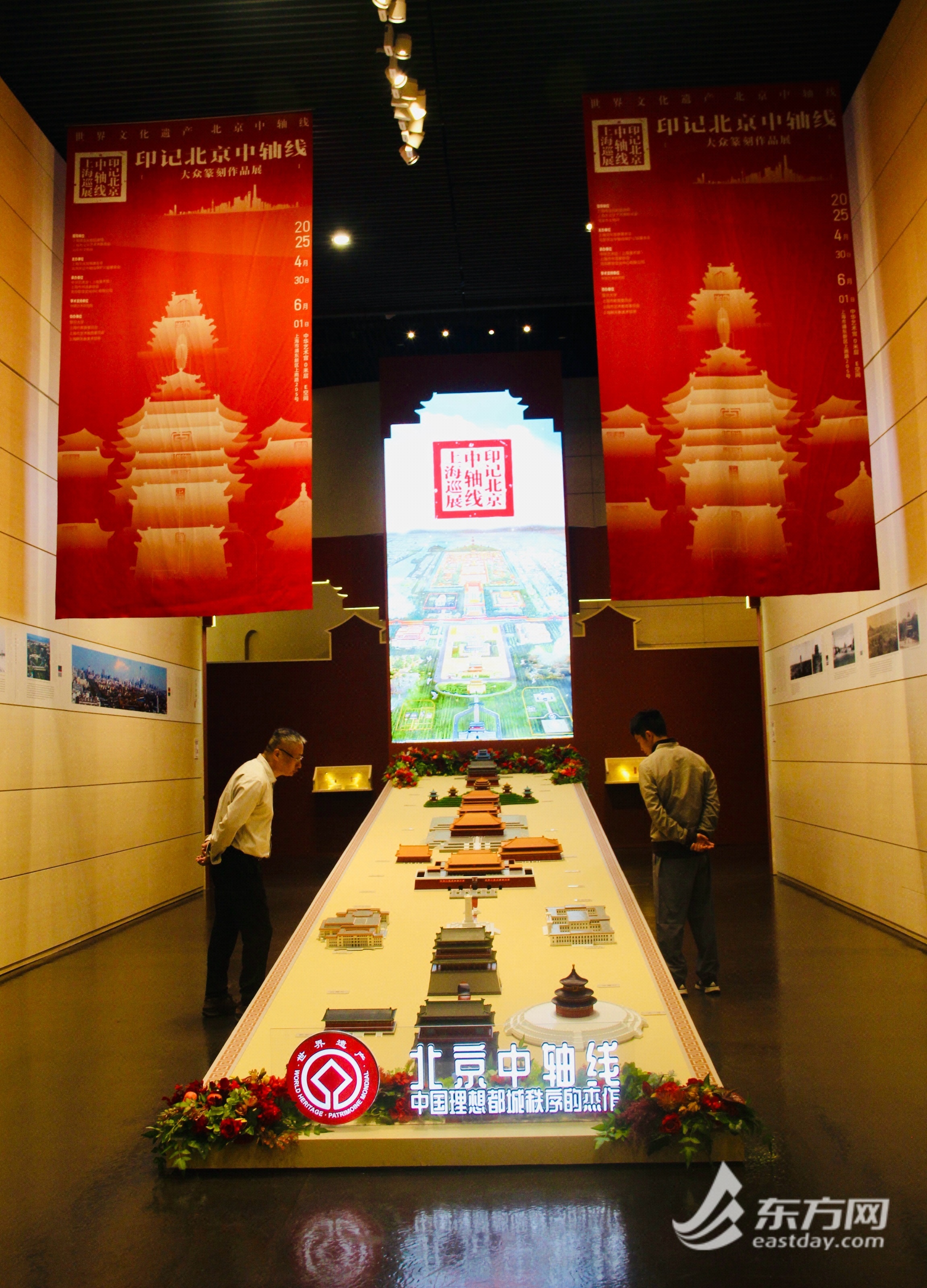整个展厅的布局被设计成了“中轴线”的路径,观众穿梭其中,仿佛置身于北京。总长7.8米的北京中轴线微缩景观模型气势恢宏,在展厅入口处颇为吸睛。