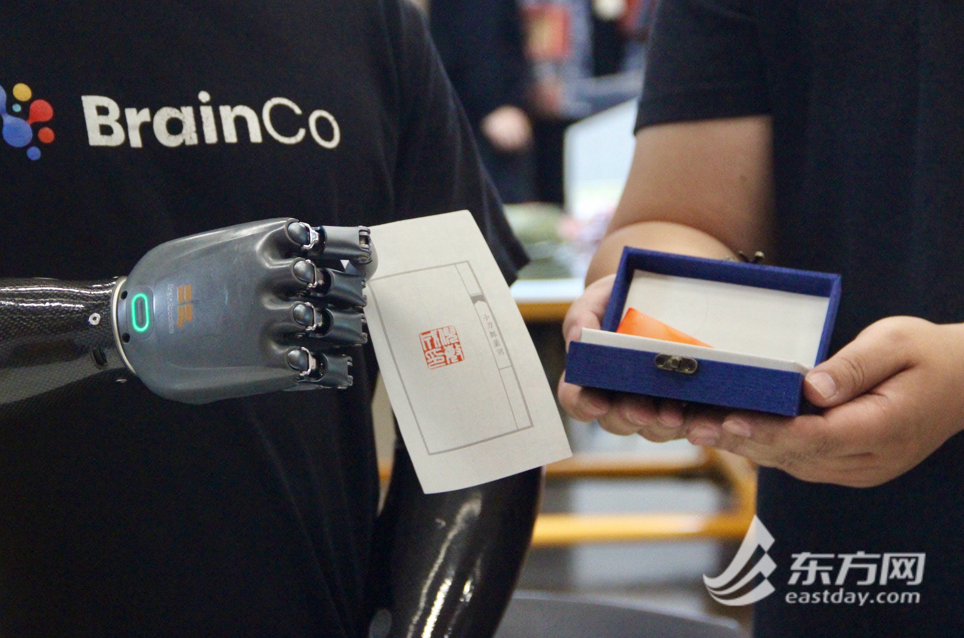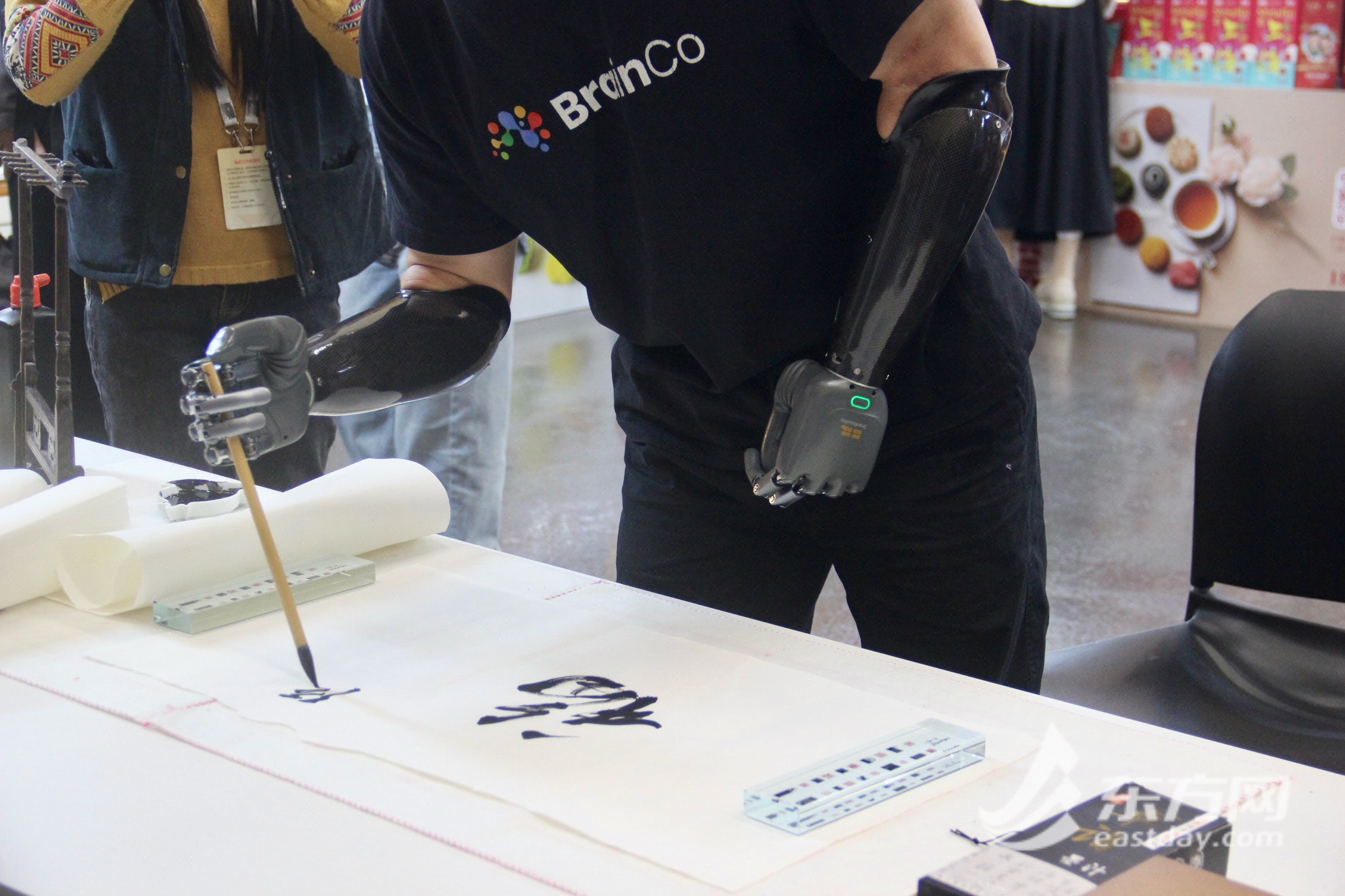 来自杭州“六小龙”之一的强脑科技展台被观众层层包围。自幼失去双手的倪敏成六年前戴上了仿生手,三年前开始练习书法。银灰色的机械手指抓握住毛笔,弯转挥动间,“印记中国中轴线”几个遒劲的大字跃然纸上。