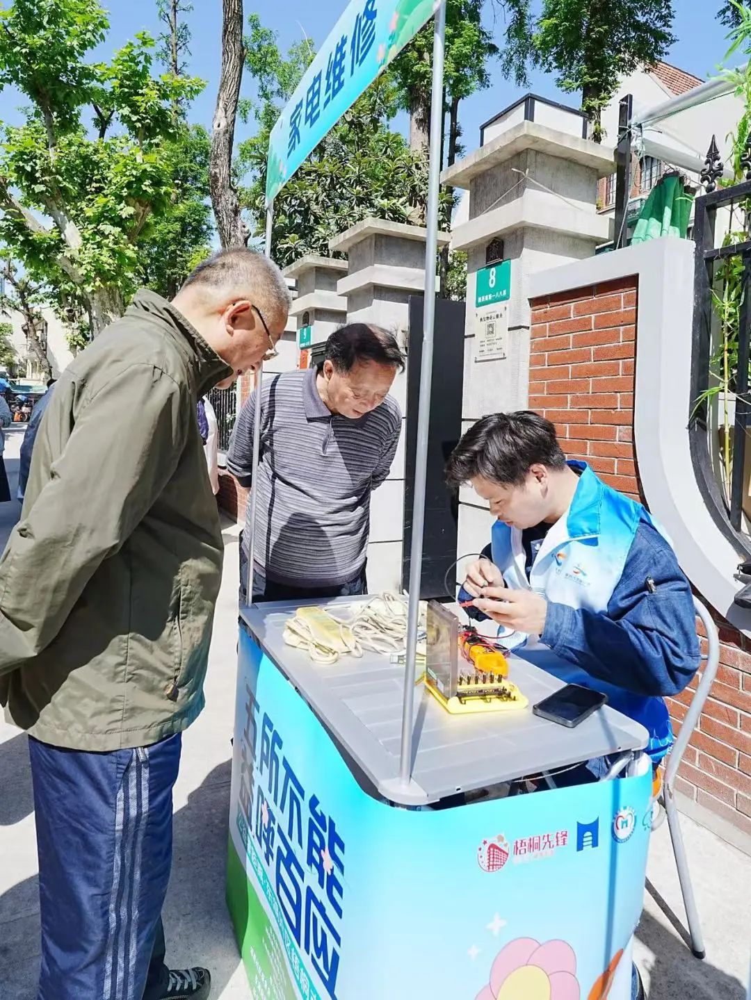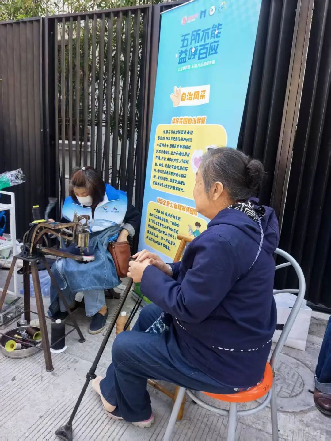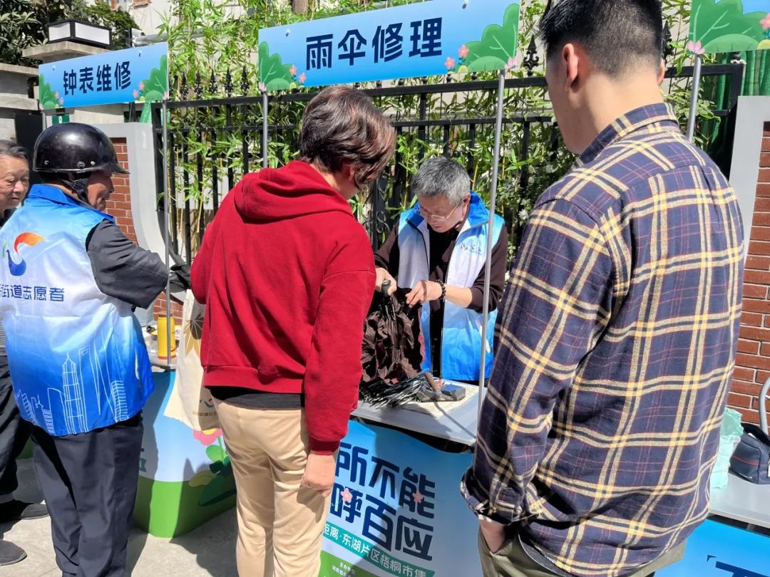 活动当天,居民们穿梭在各个“摊位”间,挑选着自己需要的便民服务。能人志愿区的各式摊位前挤满了热情的居民,等待理发的、带着破损雨伞和脱胶皮鞋前来寻求帮助的阿姨爷叔们有序地排着队。对于这场家门口的市集,居民刘阿姨表示自己收获满满:“我们年纪大了,走远一点的地方很不方便,社区里举办这样的活动,真是想到我们心坎里了。”