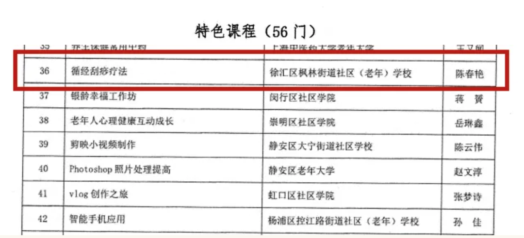 上海市老年教育课程研究与评估指导中心近日在全市范围内开展老年教育特色课程、精品课程的征集和评选活动,最终评选出81门品牌课程。其中,由徐汇区枫林街道社区学校选送、上海市气功研究所陈春艳医师主讲的《循经刮痧疗法》课程荣获上海市特色课程。