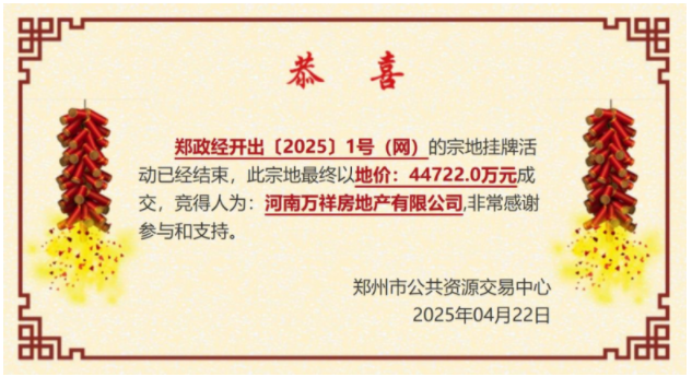 4月22日,郑政经开出﹝2025﹞1号地块经过两家公司9轮竞价,最终以44722万元成交,溢价率3.7%,竞得人为河南万祥房地产有限公司。