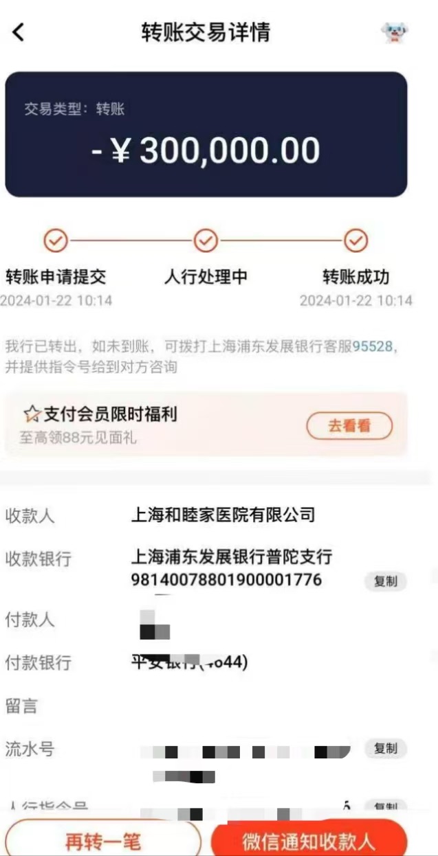 最终,潘先生于2024年1月22日从个人账户向和睦家医院转账30万元作为预缴费用。而原定1月20日的第三次手术也延期至1月22日。