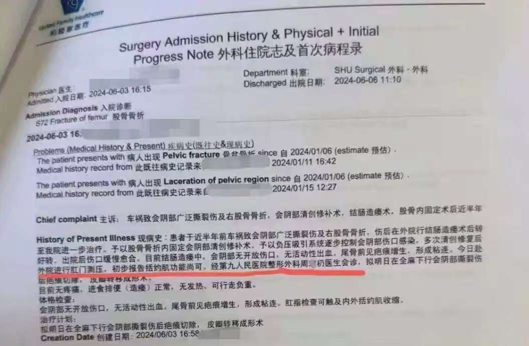 2024年6月3日的医院病历显示,潘先生赴外院进行肛门测压,初步报告括约肌功能尚可。经第九人民医院整形外科周某礽医生会诊,拟在全麻下行会阴部撕裂伤后疤痕切除,皮瓣转移成形术。
