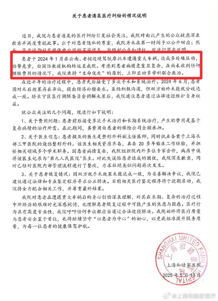 第1, 《说明》称“在尚未收到任何预缴费用的情况下,我院秉持生命优先原则,立即启动多学科联合救治。”“这段话显得医院好像很崇高无私。”潘先生表示,当时他的保险公司派了医疗专机将他从云南送至上海,“是我主动选择和睦家,而且在云南就已提前沟通过,他们知道我有高端医疗保险。”