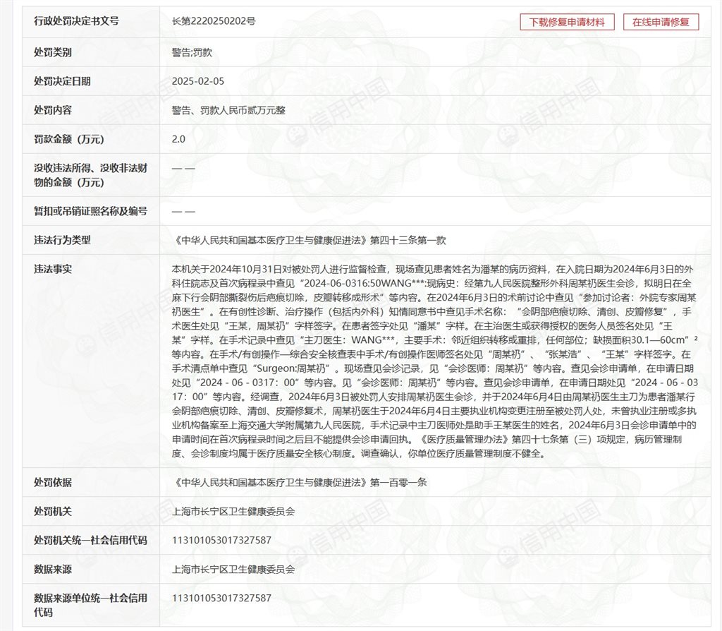 潘先生表示,自己去医院质问时,院方随即改口称周某礽医生为上海和睦家医院医生,愿意赔偿其3万元,但他不接受此方案。据“信用中国”,2025年2月5日,长宁区卫健委对上海和睦家医院作出了处罚决定,该院因存在医疗质量管理制度不健全问题被处以警告和2万元罚款。