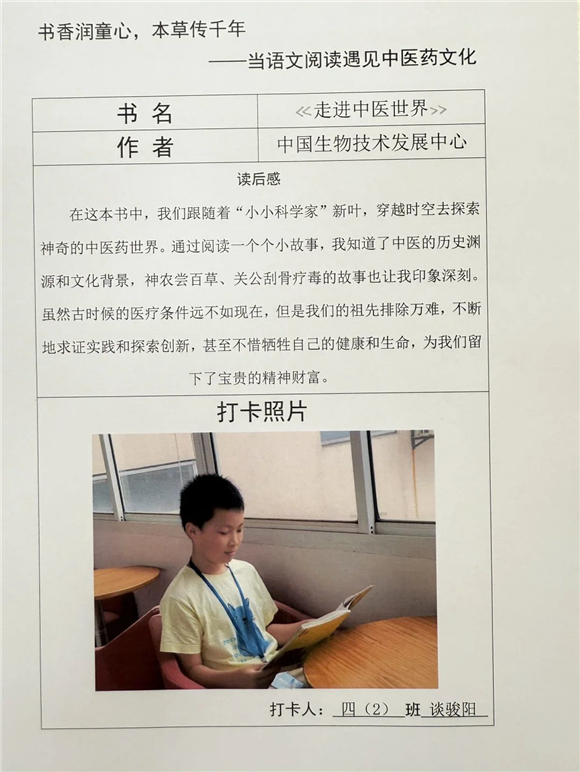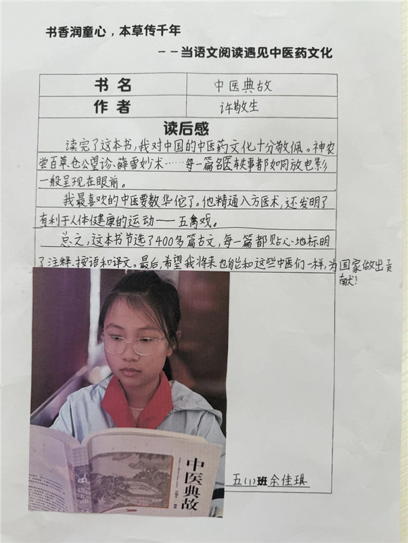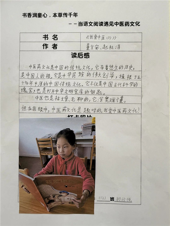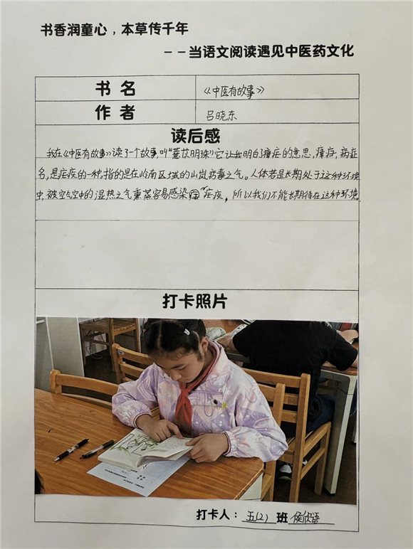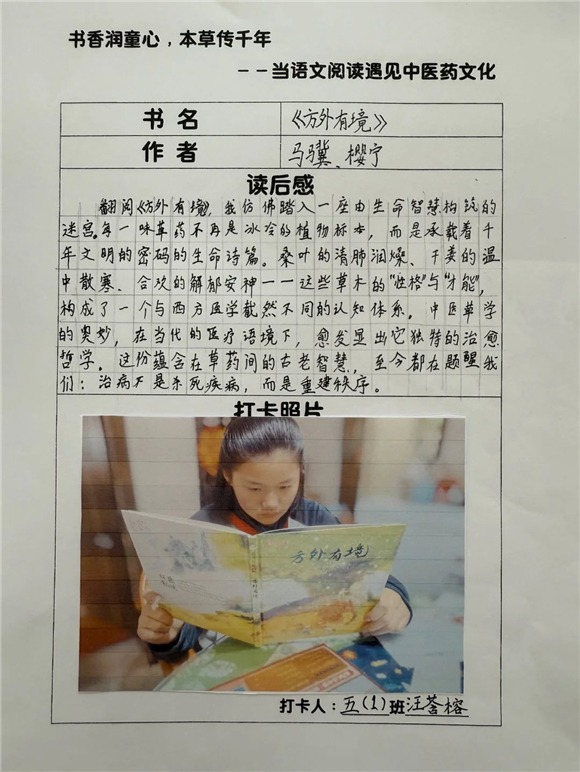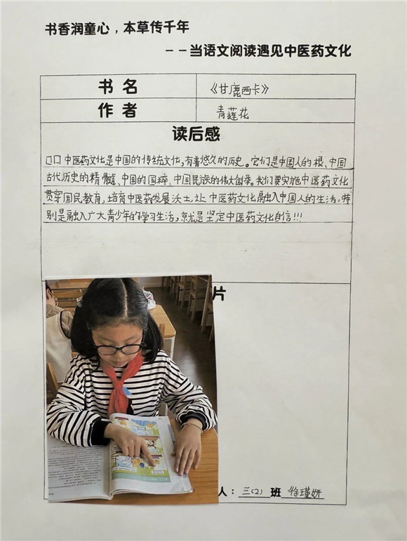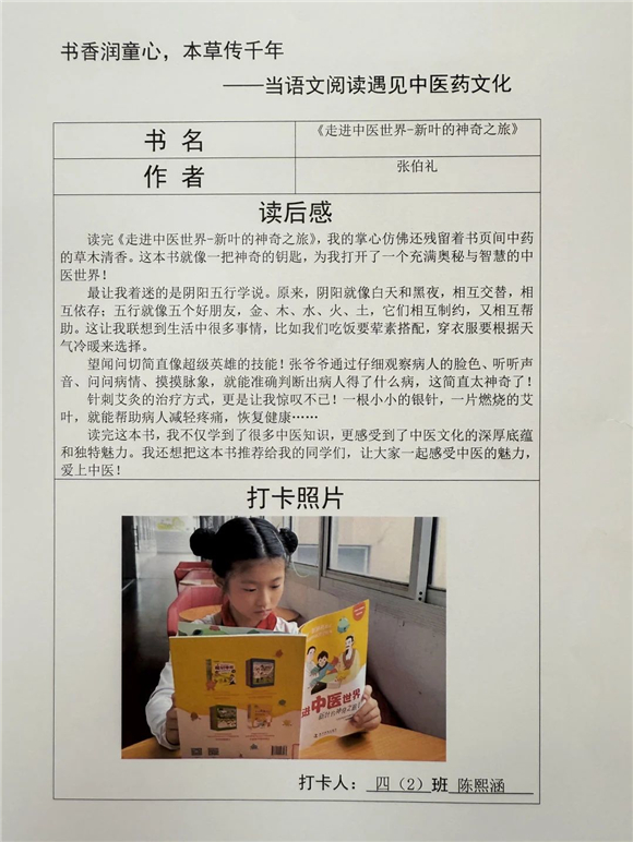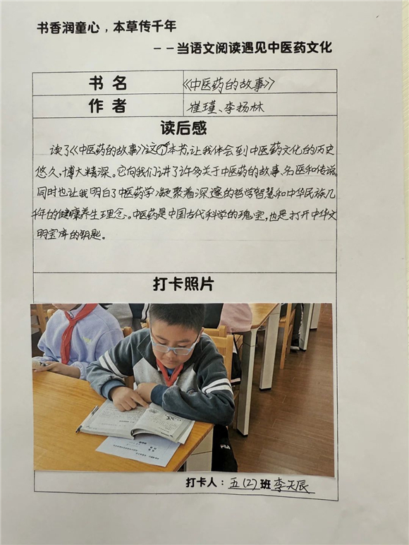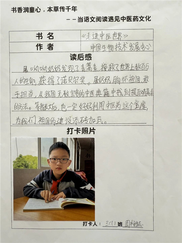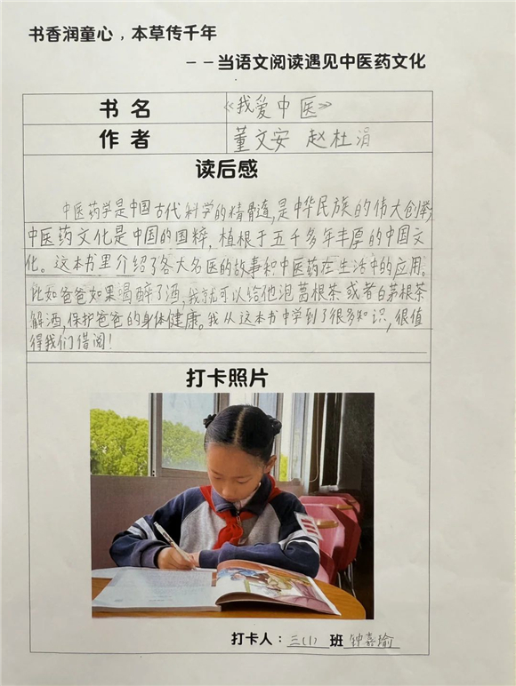 高年级(三至五年级)的学生则在充分阅读的基础上撰写读后感,将中医药文化与个人感悟紧密结合,字里行间流露出对传统文化的热爱。