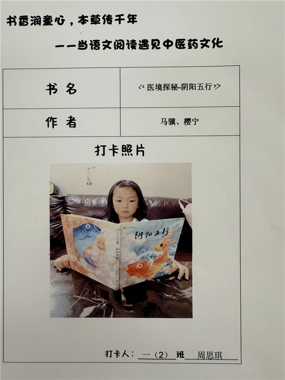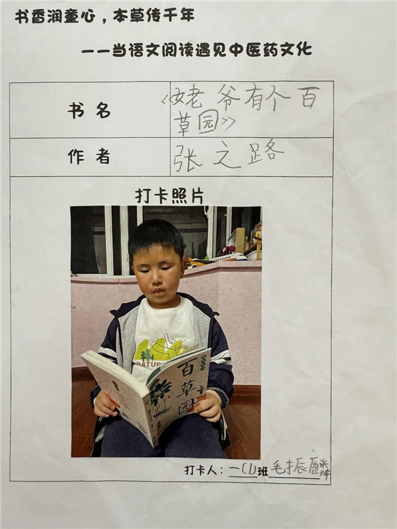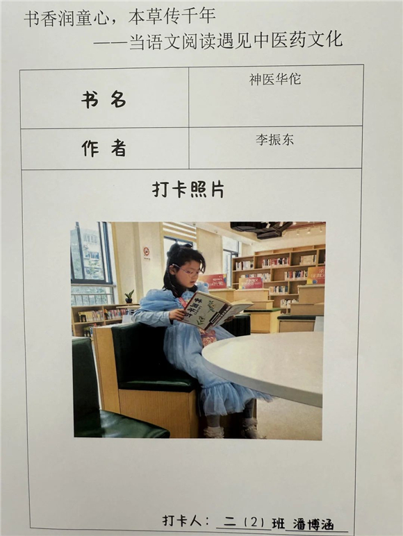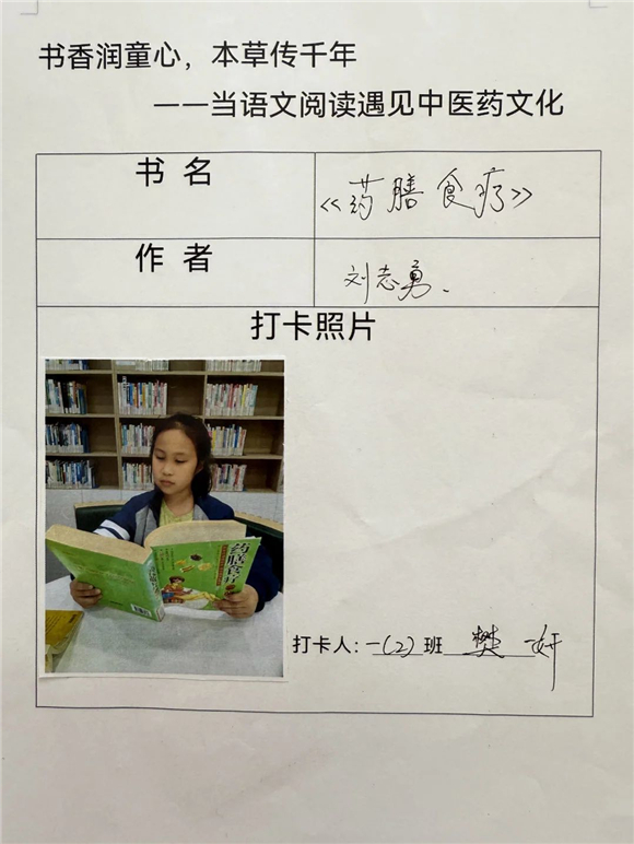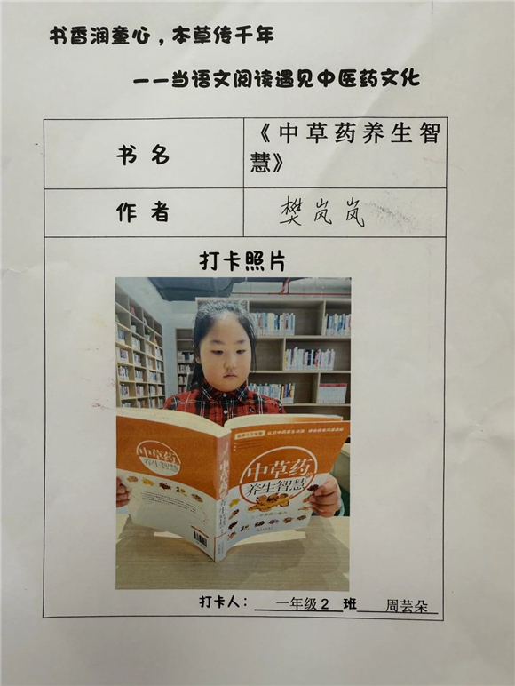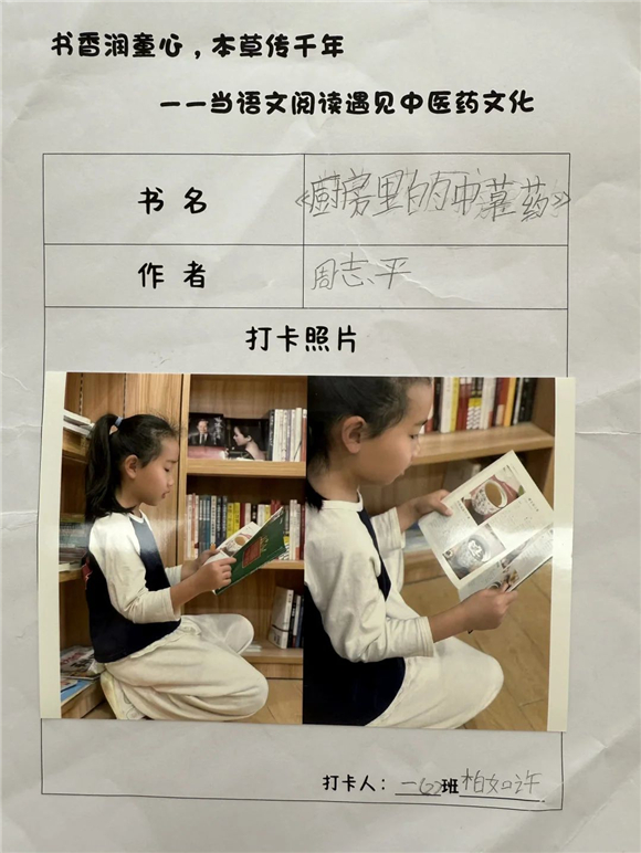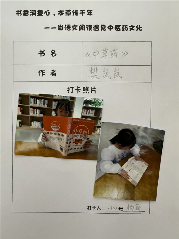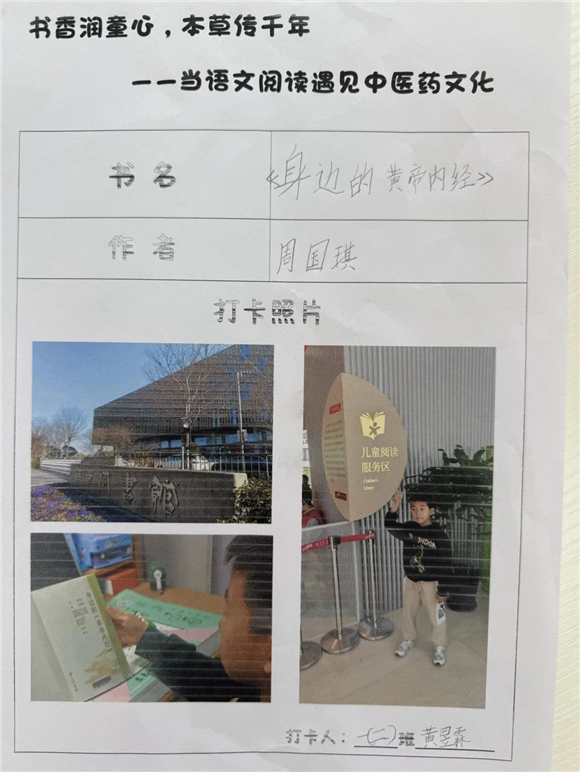 活动伊始,"中医药图书打卡行动"便吸引了全体学生的热情参与。在劳动节长假期间,家长们纷纷化身孩子的阅读引路人,带领孩子走进家附近的图书馆,开启了一场寻找中医药宝藏图书的奇妙之旅。孩子们在书架间穿梭,目光急切地搜寻着《本草纲目》(少儿版)、《中医故事绘本》等经典中医药书籍。找到心仪的图书后,他们兴奋地拍照记录,仿佛找到了开启中医药文化宝库的钥匙。