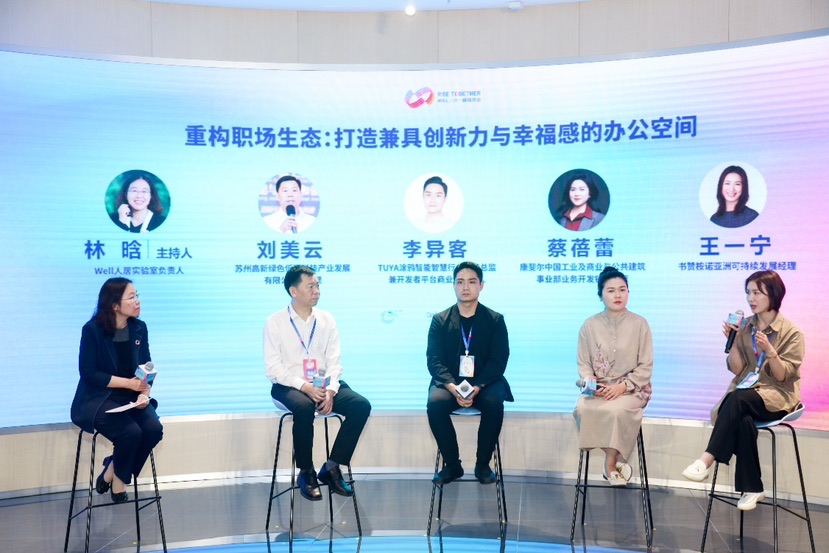 圆桌论坛聚焦办公空间的创新力与幸福感,苏州高新绿色低碳科技产业发展有限公司总经理刘美云、TUYA涂鸦智能智慧行业市场总监兼开发者平台商业化负责人李异客、康斐尔中国工业及商业与公共建筑事业部业务开发销售主管蔡蓓蕾、书赞桉诺亚洲可持续发展经理王一宁等嘉宾,分别从低碳技术实践、智能化应用、健康空气营造、可持续材料等角度,分享了各自的经验与见解。