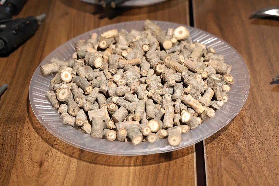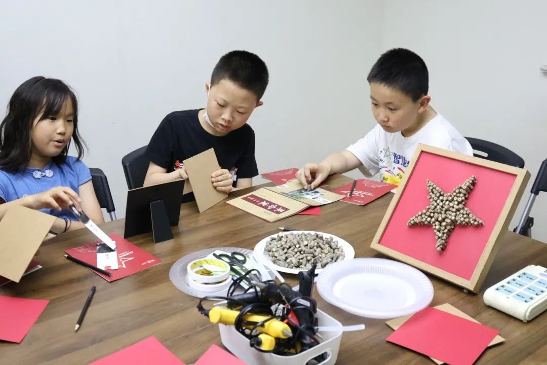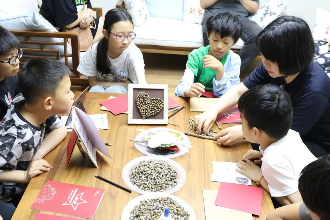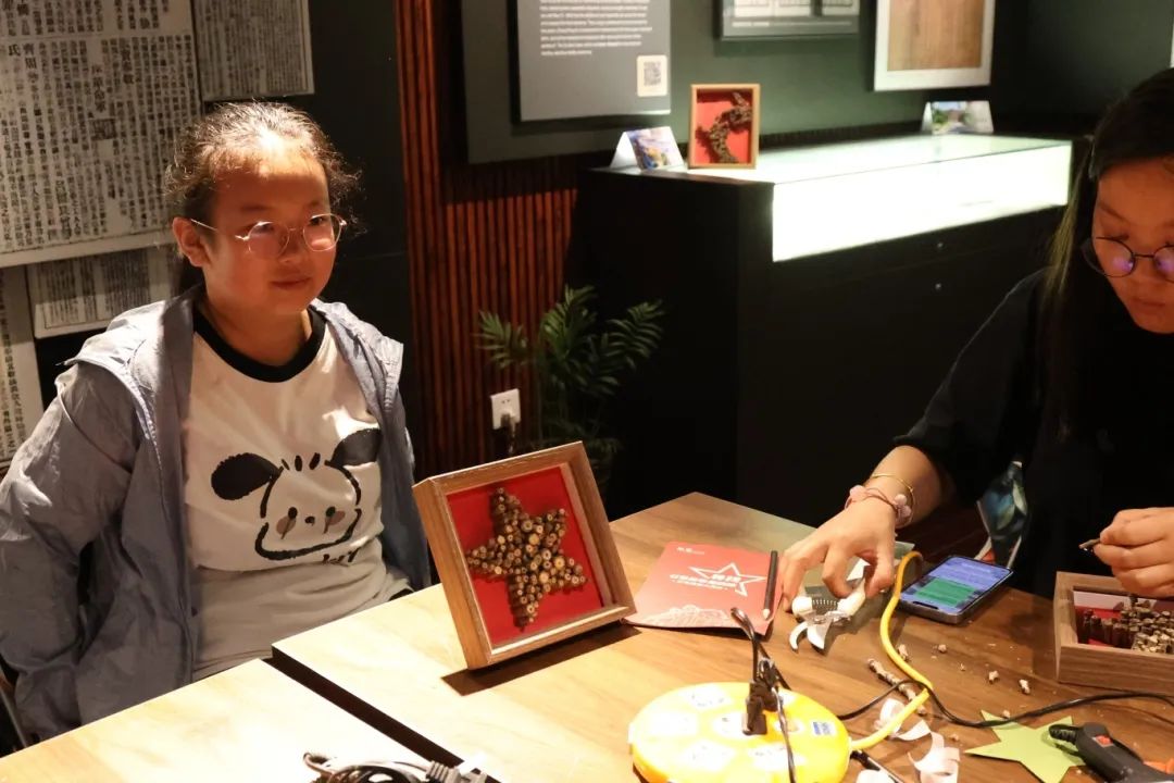 参观结束后,亲子手工制作环节闪亮登场!当天的活动主题是制作树枝画。主办方为每个家庭精心准备了红星杨树枝。主讲人王艳老师为孩子们介绍了红星杨的特性。这种独特的树种,如果将它的树枝从枝干部分剪断,枝干断面将呈现出清晰的五角星形状,仿佛是大自然赋予的红色印记。孩子们先在红纸上画出五角星、爱心的图案,再将红星杨树枝截成的小段,用胶水粘在图案上。红纸上,无数颗小小的红星杨“五角星”汇聚成一颗闪闪发光的大五角星。也有的孩子做了一颗“爱心”,准备送给爸爸妈妈。制作完成后,主办方请家长和孩子们在树枝画上写下了“我家家风关键词”,当“家风”与红星相遇,当传统与现代交融,这不仅仅是一件手工作品,更是家庭爱国情怀与优良家风的生动见证。活动结束后,邹容纪念馆还向小朋友们赠送了特制的文创成品:邹容烈士徽章和笔记本。