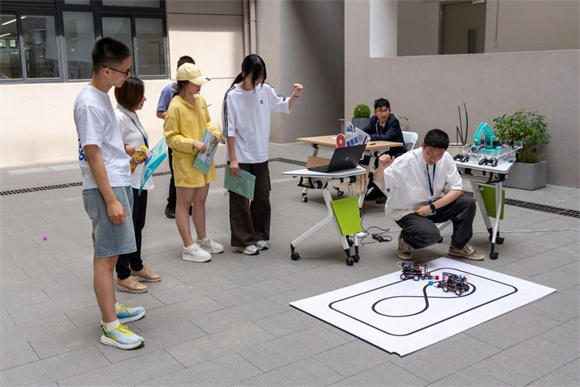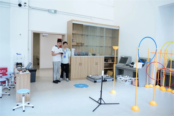 走进校园,科技风暴扑面而来——深海荧光实验室里,同学们将贝壳粉与生态材料浇筑成泛着神秘蓝光的人工礁体;在航空飞行器实验室操控无人机划出精准轨迹;在AI物流挑战赛现场通过隔空操作让机械臂与运输车在模拟区域默契协作;又来到VR救援船体验区化身虚拟机长,操控救援机穿越火光与漩涡。