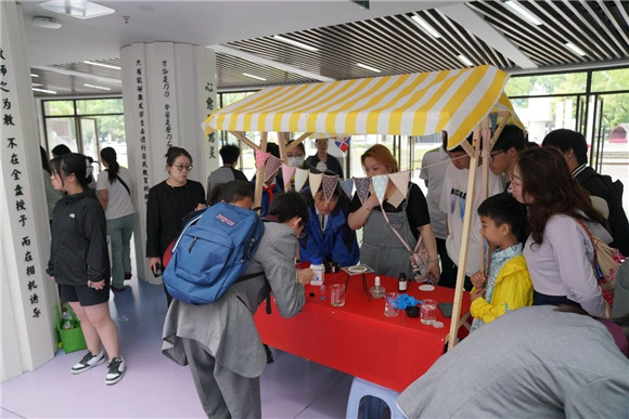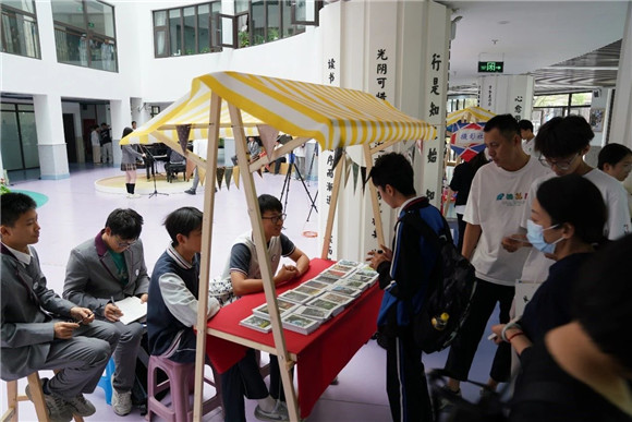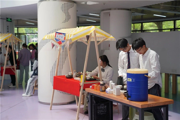 音乐会余韵未散,各社团展示区已吸引大批目光。摄影社精心准备的“周中四季”明信片备受青睐;茶艺社的同学们身着传统服饰,优雅展示泡茶技艺,邀请家长品鉴茶香;各社团的文创展示、角色巡游、现场体验等,无一不彰显着周中社团的独特魅力。在篆刻专用教室,教师亲自示范,带领访客感受传统艺术的刀笔之美,深化审美体验。