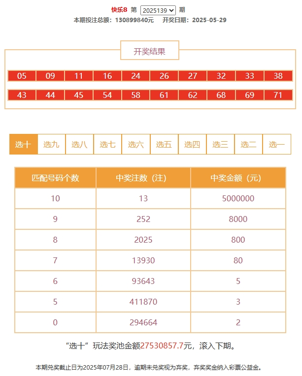5月29日晚,快乐8游戏第2025139期开奖,当期全国共开出13注“选十中十”,上海2注,单注奖金500万元。
