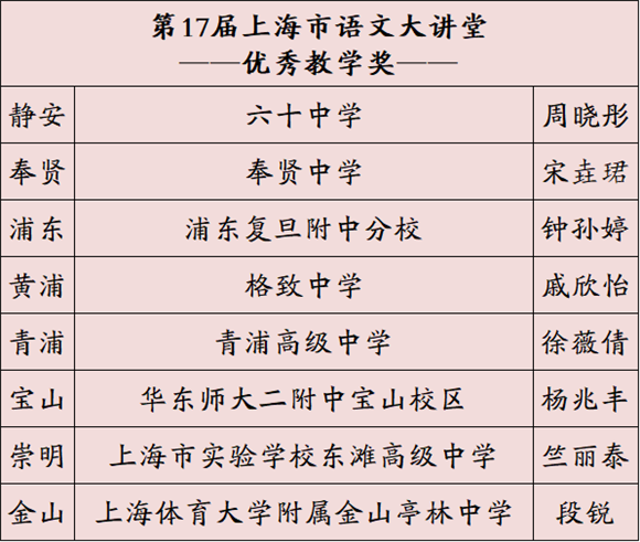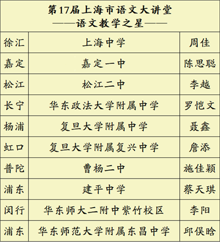 5月29日,第17届上海市语文大讲堂在华东师范大学举行。活动由华东师范大学语文教育研究中心、华东师范大学中文系主办,特邀上海市教师教育学院(上海市教育委员会教学研究室)担任指导单位。华东师范大学语文教育研究中心主任谭帆,上海市教师教育学院范飚、邹一斌,上海市语言文字工作者协会会长文贵良,华东师范大学中文系党委书记徐默凡,华东师范大学语文教育研究中心叶丽新、张心科、周宏,华东师范大学中文系《中文自修》主编汤拥华,《中文自修》副主编孙国强,上海师范大学詹丹等担任嘉宾与评委。