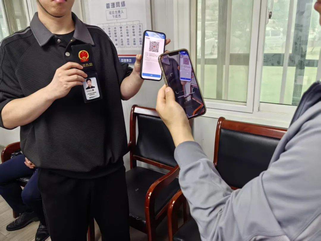 区安质监站执法人员到达项目现场后,遵循“检查必亮码”的要求,第一时间向施工现场的企业负责人出示“检查码”,亮证执法,并告知此次检查的内容、要求以及程序。企业负责人可以通过“随申办”移动端扫描“检查码”,核验检查任务内容和执法人员资格。整个过程通过执法记录仪同步全程记录,确保每一个环节都有迹可循。