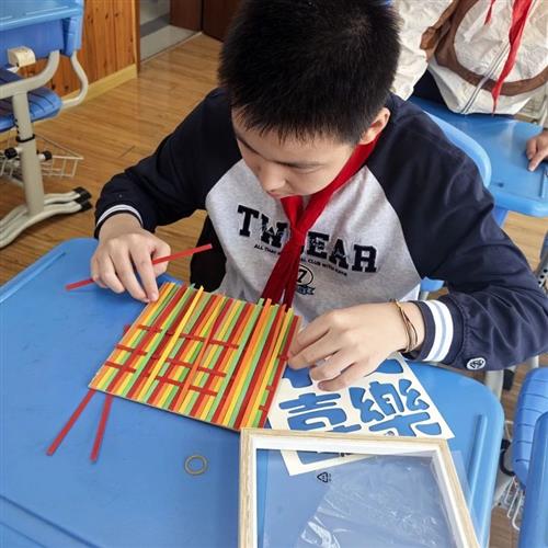 与此同时,纺织机体验让队员们亲自尝试经纬交织的古老技艺,感受古人的劳作智慧;而竹编画制作则吸引着队员们用灵巧的双手将柔韧的竹篾编织成充满童趣的图画。