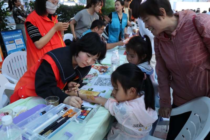 “奶奶你看,我的手臂上有一只小精灵在跳舞!”鹦鹉洲艺术馆展位前,不少爱美的小女孩大胆地前来体验手臂彩绘的新奇与魅力。形式多样、内容丰富的市集展位吸引到了从小朋友到阿姨爷叔各个年龄段的市民。