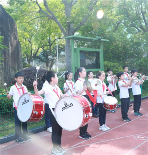 活动当天,莱阳小学校园内鼓号嘹亮,队旗飘扬。英姿飒爽的鼓号队员们以整齐的队列和昂扬的乐章,奏响了活动的序曲,迎接每一位满怀喜悦步入校园的小葵花们。