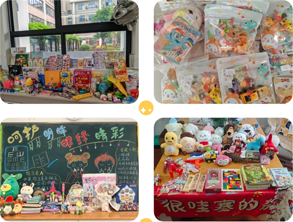 同学们从家中带来了闲置的玩具、书籍、文具和手工艺品,更有心灵手巧的同学特意制作了精美的贺卡和画作;老师们也热情参与,捐赠了书籍、装饰品和生活用品等物品;共建单位更是大力支持,送来了文具套装、体育用品等实用物资。短短一周内,教室和办公室就堆满了琳琅满目的义卖品,每一件都饱含着捐赠者的深情厚谊。