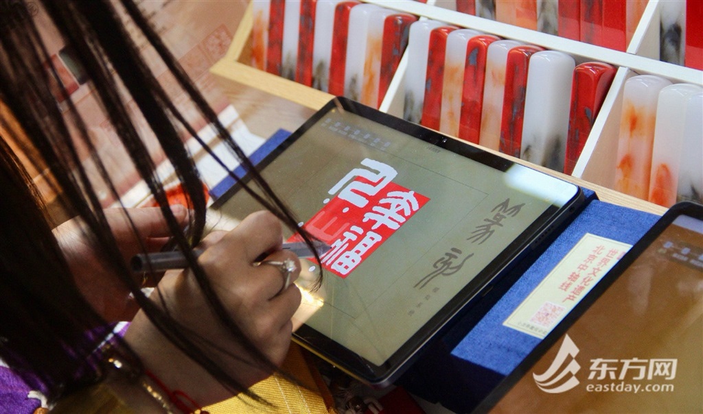 展厅内的文创互动区内,韩天衡传承艺术中心的“小刀郎”展区备受欢迎,专业老师现场指导观众创作了700余件数字篆刻作品。与此同时,“小刀郎”展区也成为中国文化向海外传播的鲜活载体,接待了来自英国、俄罗斯、美国、奥地利等20多位国际友人。他们亲手制作印章,领略汉字的独特韵味,感受中国文化的魅力。