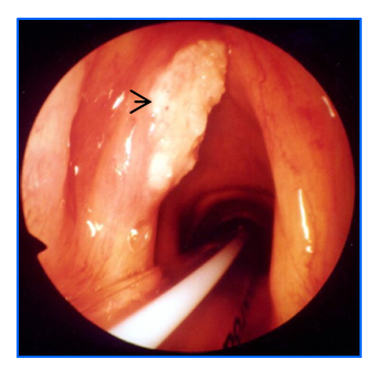 箭头所指为喉癌病变部位