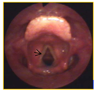 正常电子喉镜图片,箭头所示为声带