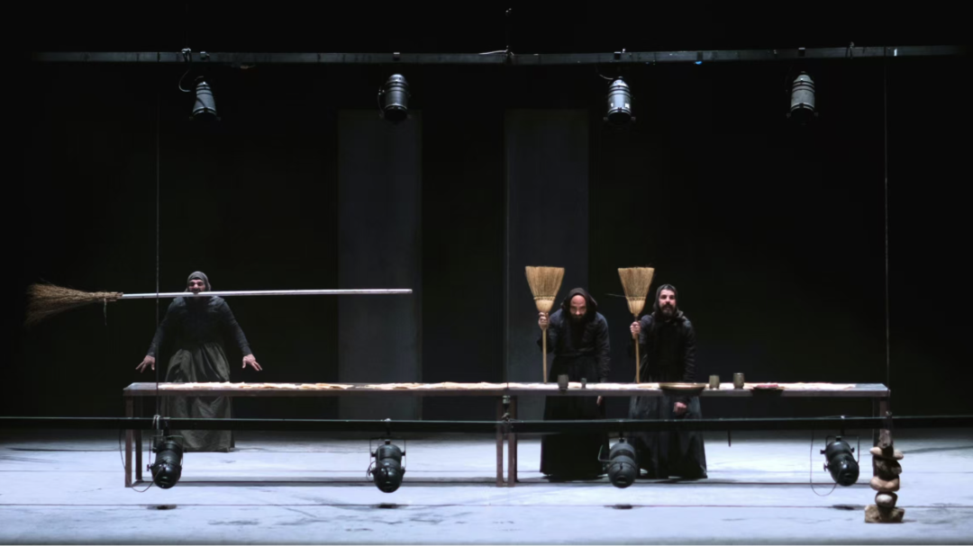 在塞拉看来,撒丁岛语是“由身体发出的活的语言”,其粗粝质感和原始魄力与《麦克白》的权力暴力主题形成惊人共鸣。其创作灵感源自撒丁岛巴尔巴吉亚地区古老的狂欢节仪式。舞台上,牛铃、兽皮鼓、牛角与软木器具交织出神秘声景,金属撞击声与吟诵声穿透黑暗。演员们以仪式化肢体动作构建场景,极简灯光在扬尘中切割空间,将莎剧精髓转化为超越语言的视觉史诗。