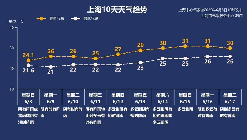 放眼未来一周,梅雨带维持在长江中下游一带,并南北摆动,上海仍多降水过程。其中,下周二西南急流加强,降水比较明显。下周三后期至周六白天降水减弱,以多云到阴有时有阵雨的天气为主,周六夜里至周日雨水暂歇,以云系变化为主。受雨水的影响,下周一至周三的气温起伏不大,在22~26;周四起气温回升,预计下周周后期最高气温可达29~31℃,体感会变得闷热起来。