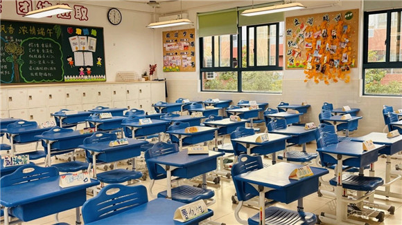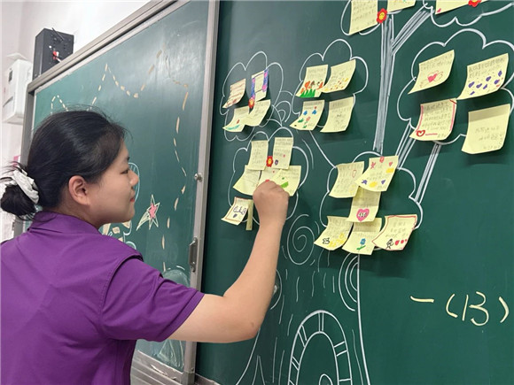 黑板上一幅用粉笔画的大树格外显眼——深褐色的树干分出几道粗枝,枝桠间点缀着五颜六色的“叶子”,每片“叶子”上都贴着孩子们写的“自己的进步或优点”。有的家长径直走到树前,踮脚寻找熟悉的字迹;有的家长则蹲下身,仔细辨认贴在低处的便利贴。