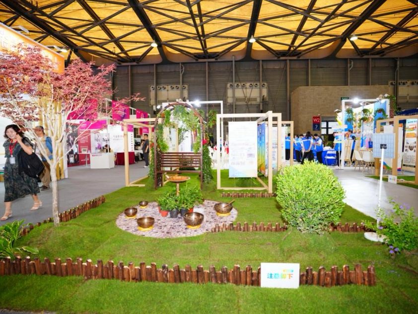 这个占地384平方米的空间,以“自然疗愈”为核心理念,融合了园林艺术场景、感官刺激、怀旧疗法与数字科技,构建了品牌区、沉思区、科普区、互动区、怀旧区、收获区等六大特色主题展区。参观者可以在这里体验栀子花、夜香树等芳香植物带来的“呼吸疗愈”,感受颂钵、风铃组成的自然音景,提升专注力与情绪稳定性。