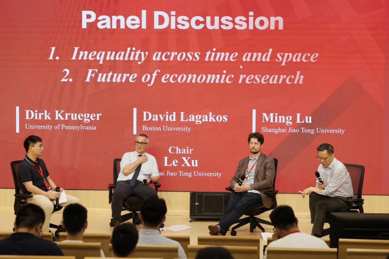 随后,在圆桌论坛环节,上海交通大学安泰经济管理学院特聘教授、中国发展研究院执行院长陆铭、Dirk Krueger、David Lagakos和徐玏围绕全球化和AI 技术对收入不平等的影响、以及中国经济研究的未来展开了讨论。作为国际顶级经济学刊物的主编,Dirk Krueger和David Lagakos分享了对经济学研究未来发展的观点,表达了对中国经济学研究的鼓励。有关全球化和技术进步对收入不平等的影响,Dirk Krueger指出,不要忽略两者本身“做大蛋糕”的效应。当“蛋糕”做大以后,如果人们不满意他的分配结果,可以使用税收等政策调整分配结果,而不应该因为潜在的收入不平等后果阻止技术发展。David Lagakos指出,教育的不平等对于收入分布有着重要的影响,如何在不同区域间分配教育资源是一个重要的课题。