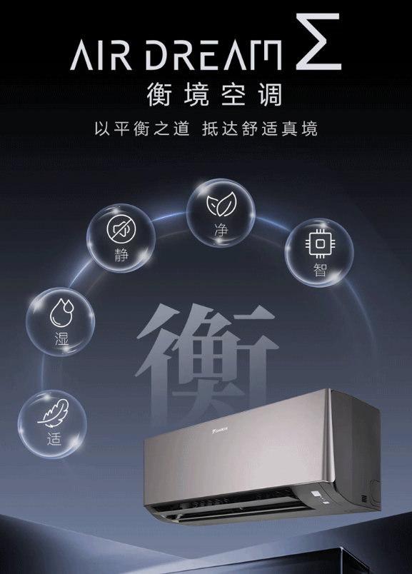 Air Dream Σ 衡境空调是大金今年推出全新一等能效的空调,集“适、湿、静、净、智”五维平衡,从舒适性、湿度管理、静音性、空气净化和智能控制,全方位提升用户的使用体验。