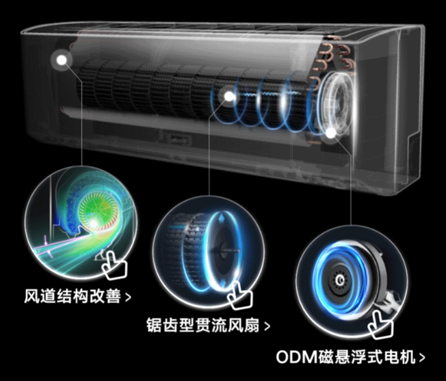 · ODM磁悬浮电机:利用磁力驱动风扇运转,风扇和马达不直接接触,因此减少了摩擦共振,不仅动能强劲,而且更高效、更低音。