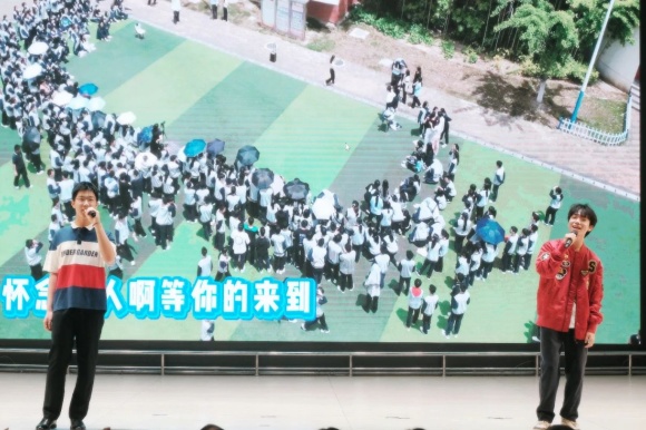 全体高三班主任上台,由各班学生代表向班主任们献上花束,表达衷心的感谢,班主任老师们一起喊出金榜题名的祝福,大家都为之感动。
