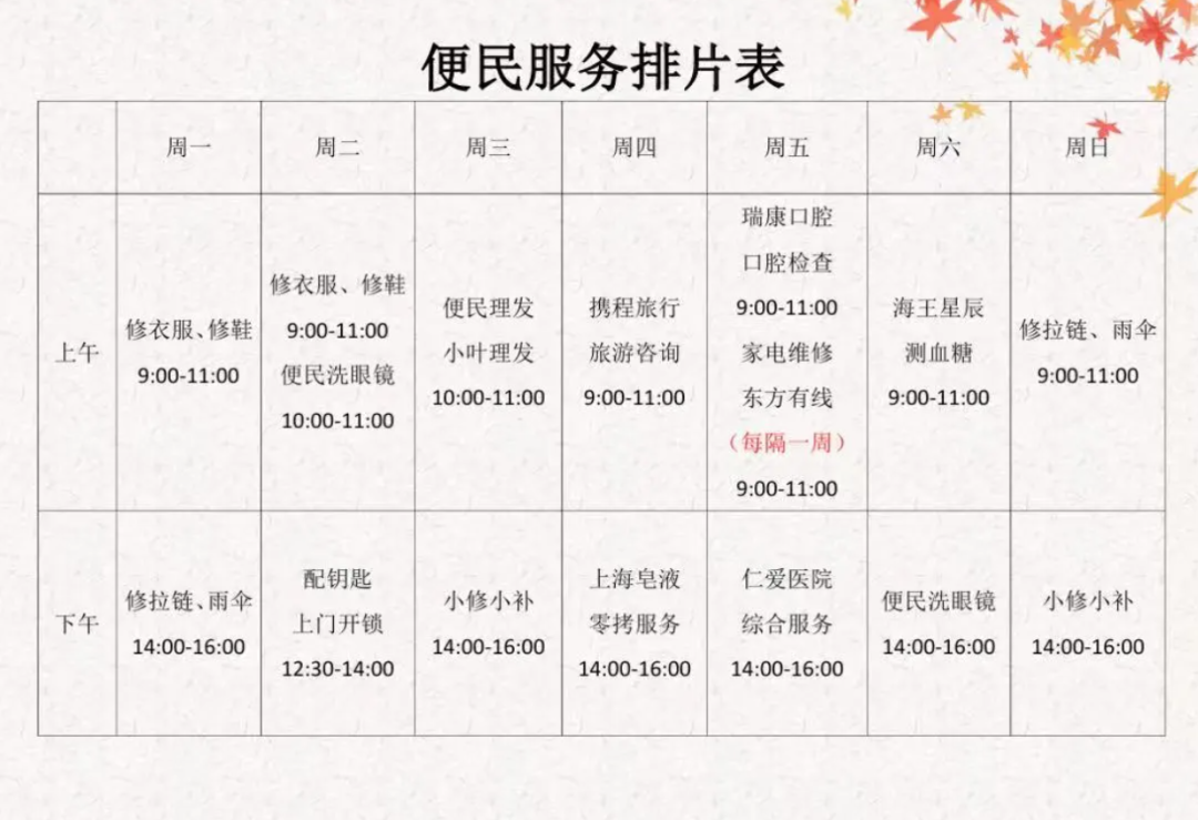 近期便民服务安排表,具体活动以实际为准