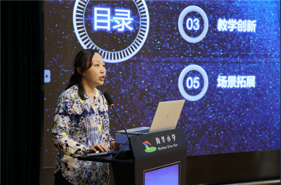 会议伊始,海华小学校长陈菊致辞。她指出,教育是面向未来的行业,人工智能时代下教育的底层逻辑正在被重构。未来,我们亟需将教育重心转向能力培养与主动探索,引导学生认识人工智能的底层逻辑并借助其协同学习;要培养适应未来社会发展需求的人才,立足人的全面发展来整体架构实施学校的人工智能课程。