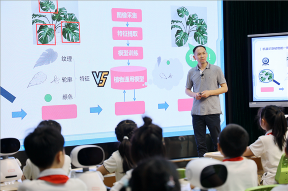 海华小学陈强老师在《植物养护小助手》的教学展示中,通过列举银杏、郁金香等植物的养护方式,自然过渡到借助AI技术精准识别植物的学习目标。课堂实践环节,陈老师指导学生分组完成编程任务,将AI原理、编程实践、实验和科学探究进行有机结合,让学生感受AI在小区植物养护中的奇妙应用。整节课以“问题驱动—实践验证—伦理思考”为脉络,既让学生掌握AI识别植物的技术逻辑,也培养了其辩证看待技术的理性思维,实现了技术教育与价值观培养的同频共振。