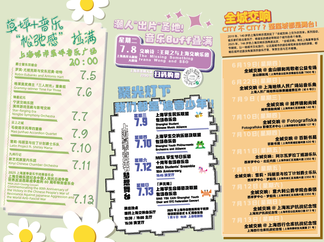 11场风格各异的演出将于6月下旬至7月中旬,在遍布上海的8个特色场地接力上演,包括:金山区颐和苑养老社区、锦和越界尚城、西岸梦中心街区、淞沪抗战纪念馆、四行仓库、上海地铁人民广场站音乐角、百新书局以及Fotografiska影像艺术中心。音乐将融入社区生活、二次元文化空间、历史纪念地、商业街区与公共艺术场所。届时,整座城市就如同一个打开的音乐厅,让市民游客在城市的各个角落与音乐不期而遇。