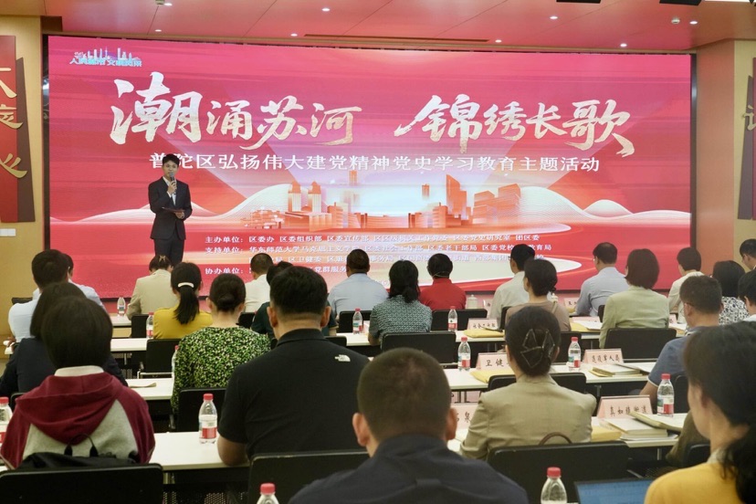 上海是中国共产党的诞生地,普陀是沪西的革命摇篮。近年来,普陀区不断推动党史学习教育走深走实,举办红色文化季主题活动,开展《口述普陀 城市更新》、普陀乡土读物等编纂工作,推出“半马苏河 工运之声”百场沉浸式主题宣讲、《百年荣光 致敬先锋》主题展、《燎原1925》文献音乐剧,制作四集《请来红色打卡地》(普陀篇)等,持续推动党史学习教育“七进”。在庆祝中国共产党成立104周年之际,由区委办、区委组织部、区委宣传部、区区级机关工作党委、区委党史研究室、团区委联合举办的党史学习教育主题活动,进一步激励引导广大干部群众在学史用史中守初心、担使命、聚合力、建新功。